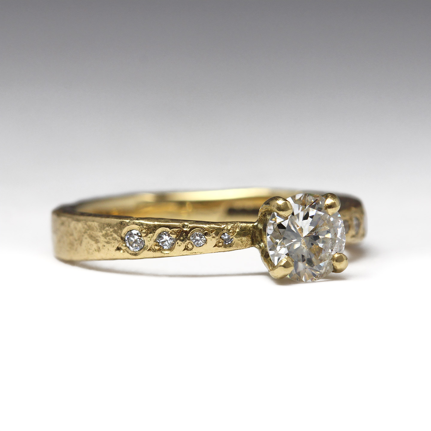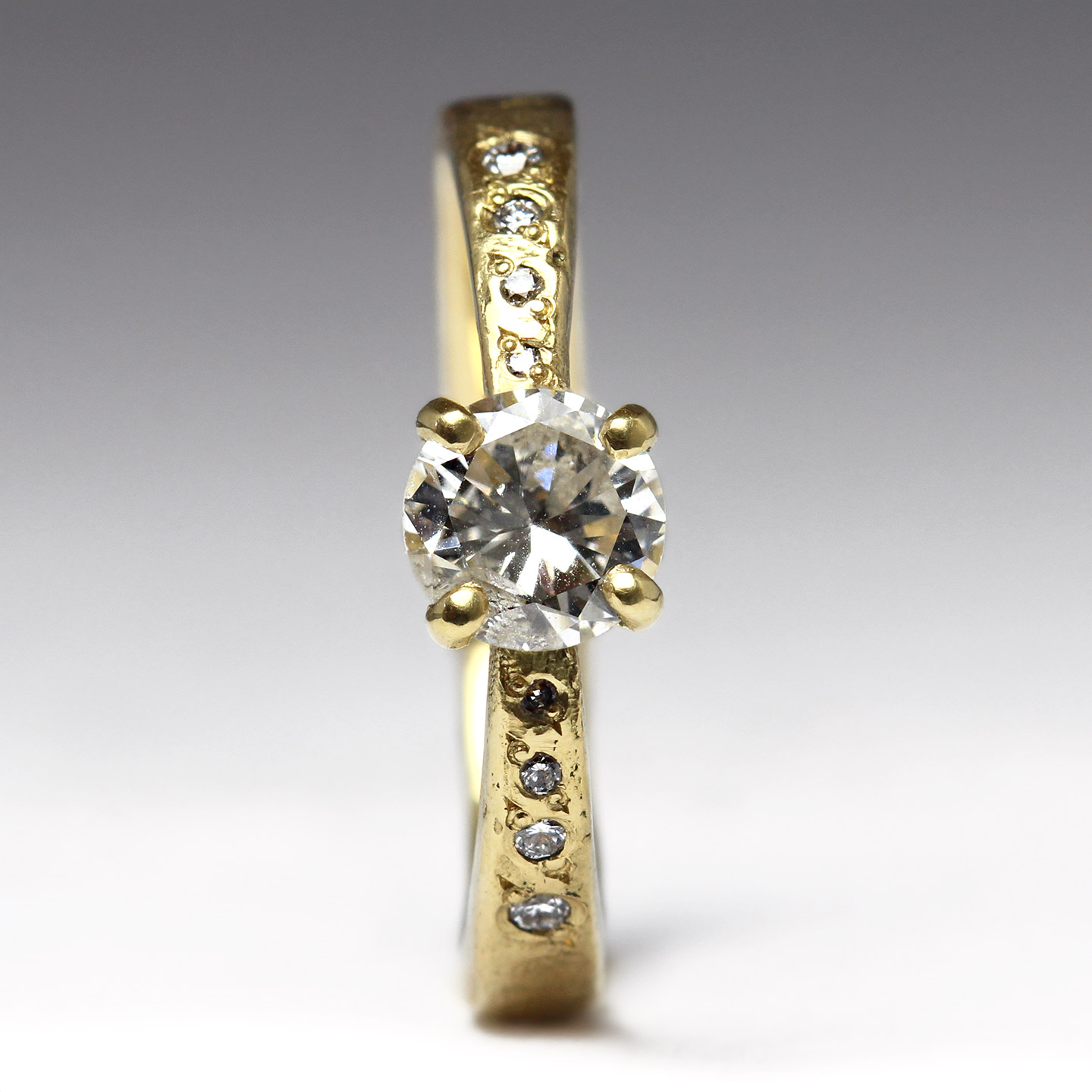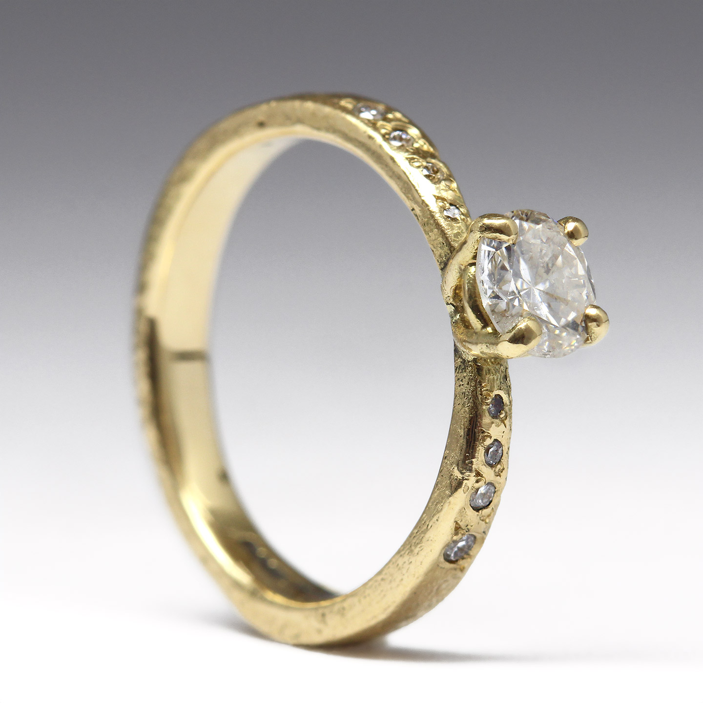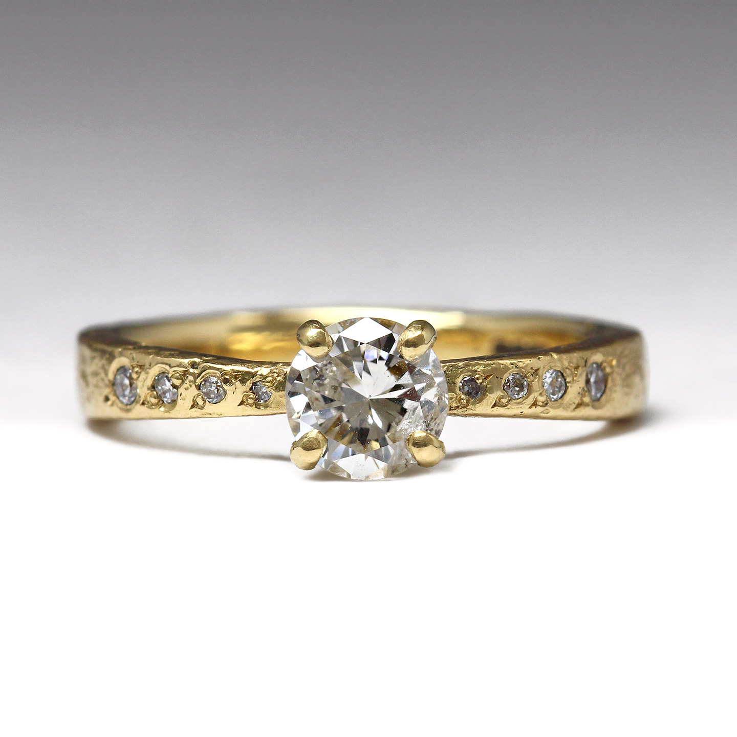 18ct Yellow Gold Sandcast Engagement Ring with Heirloom White Diamond & Eight Bead Set Vintage Diamonds