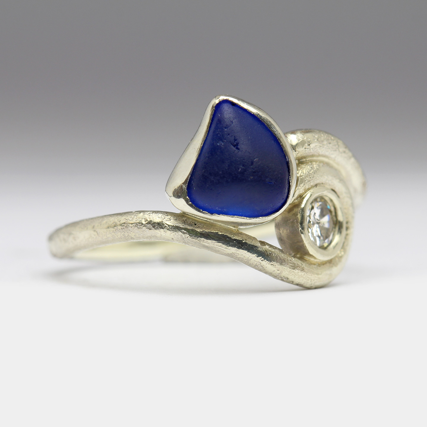 9ct White Gold Sandcast Wave Ring with Bezel Set Seaglass & Diamond