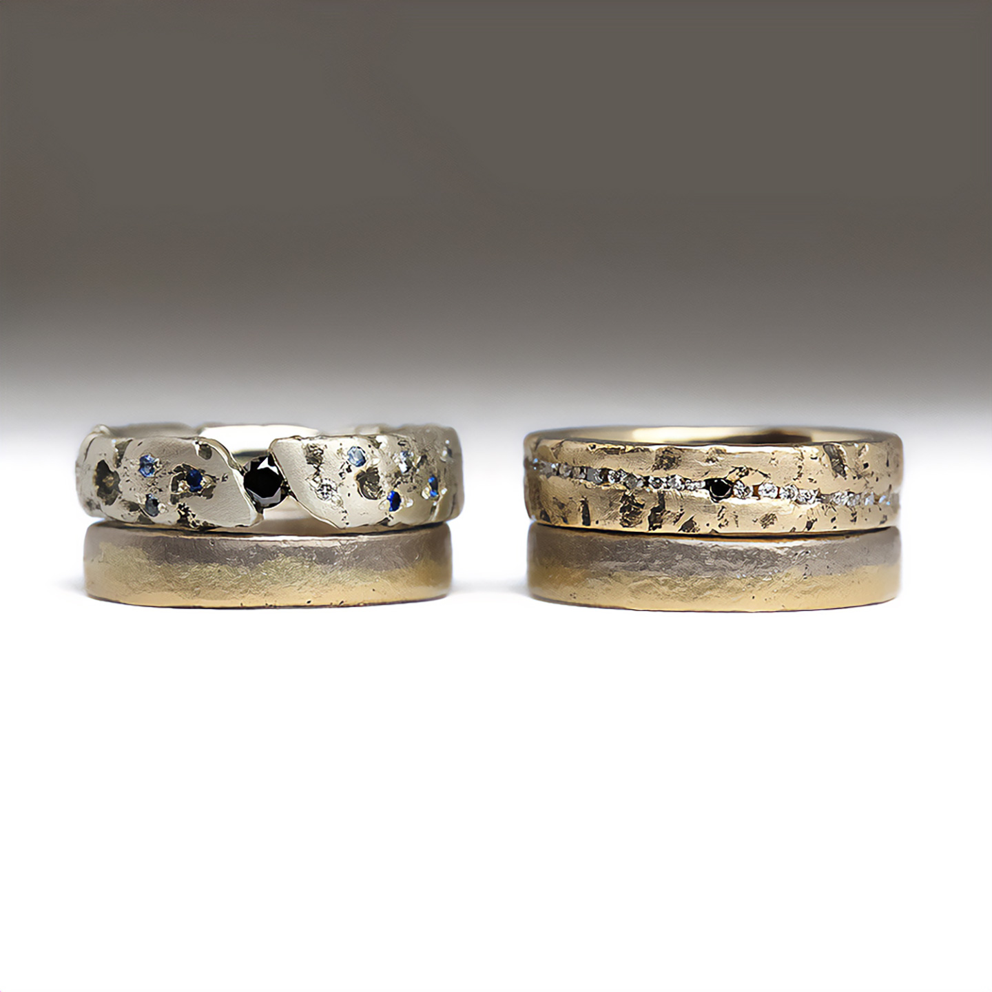 We adore the mixture of metals across all four rings, with the combination of colours and carats of gold harmonising beautifully. The dual toned wedding bands were cast in 18ct white and yellow gold, with the metals flowing into one another like tides meeting the shore. The glittery engagement rings were also white & yellow gold, cast in softer hues of 9ct before being set with a dazzling organic channel of white & black diamonds, and a scatter of beautifully ocean toned sapphires.