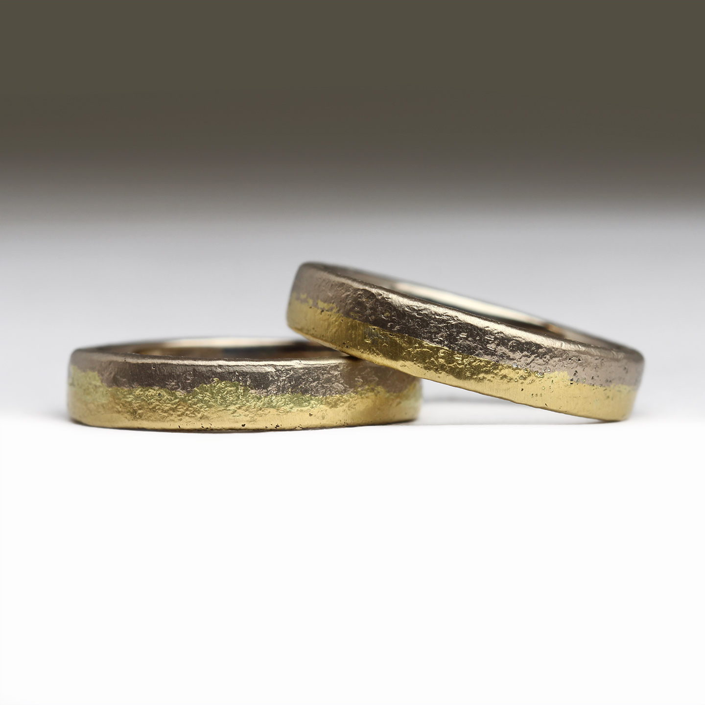 The wedding bands were finished with an antique polish to highlight the contrast between steely hued 18ct white gold and the buttery richness of 18ct yellow gold. We find the high shine finish provides a beautiful contrast to the matte finish of the engagement rings. We have compiled a journal post detailing an overview of the differences between the colours and carats of precious metal that we work with, which you can read here - Comparing Precious Metals.