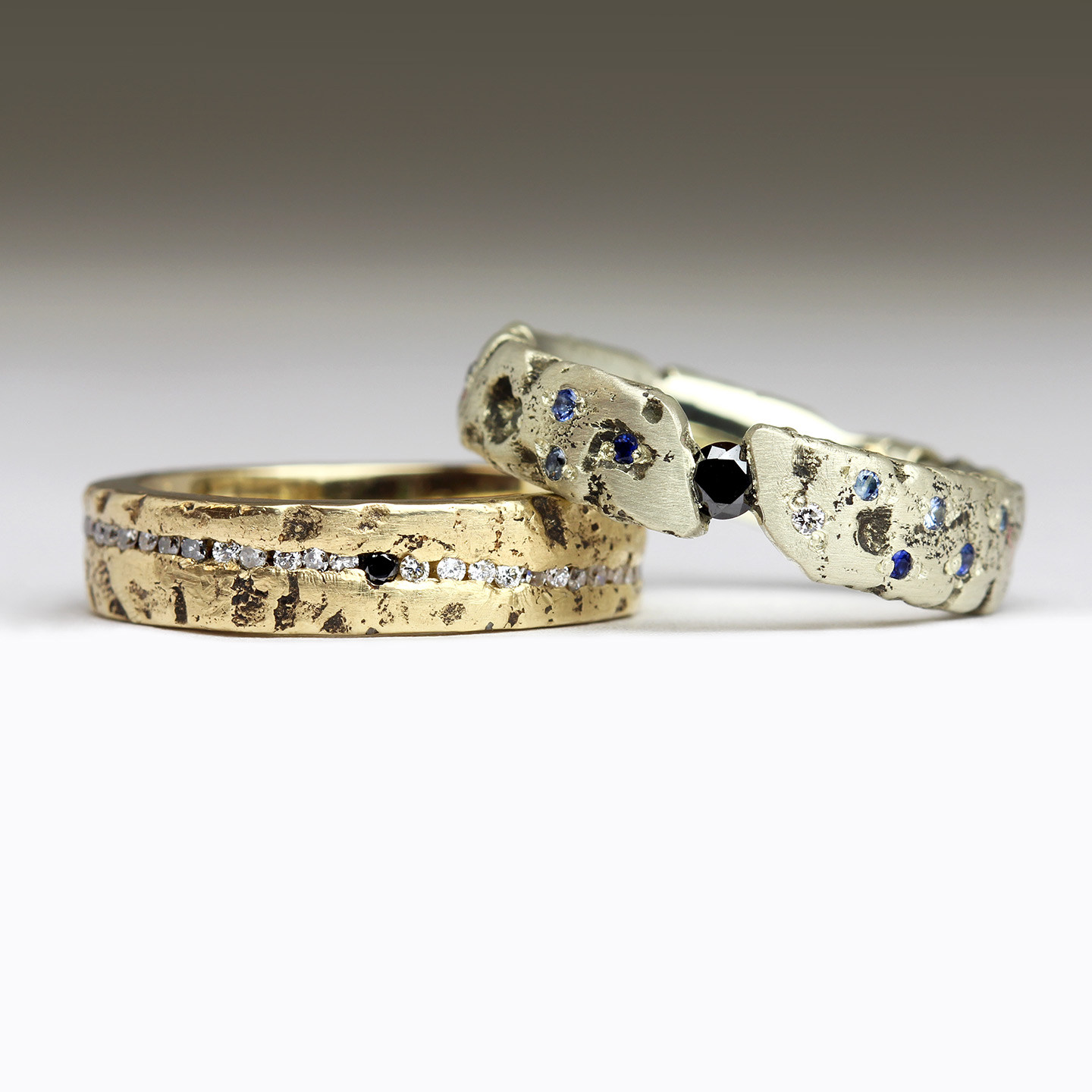 Diamond & Sapphire Extra Texture Sandcast Engagement Rings with 18ct Two Toned Sandcast Wedding Rings