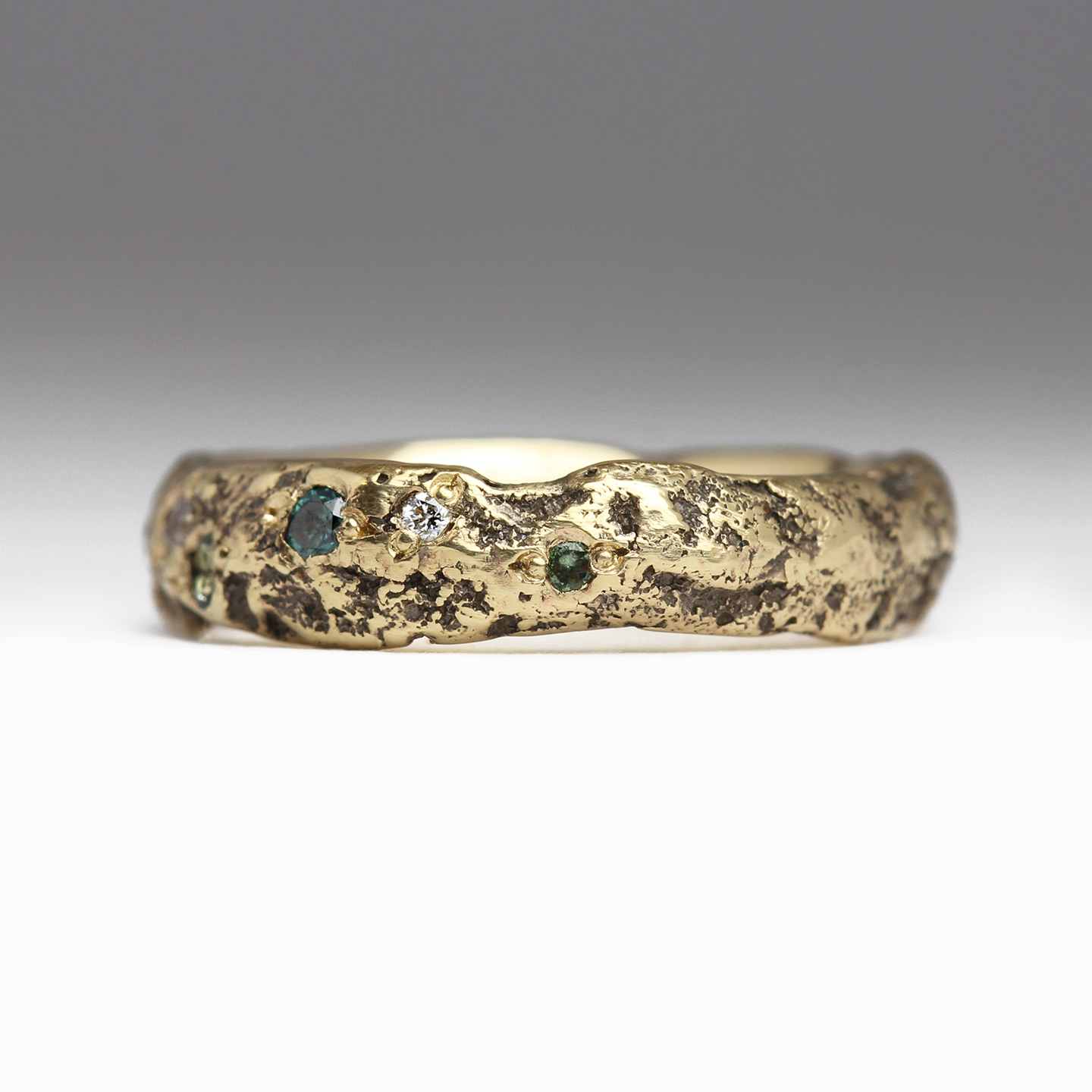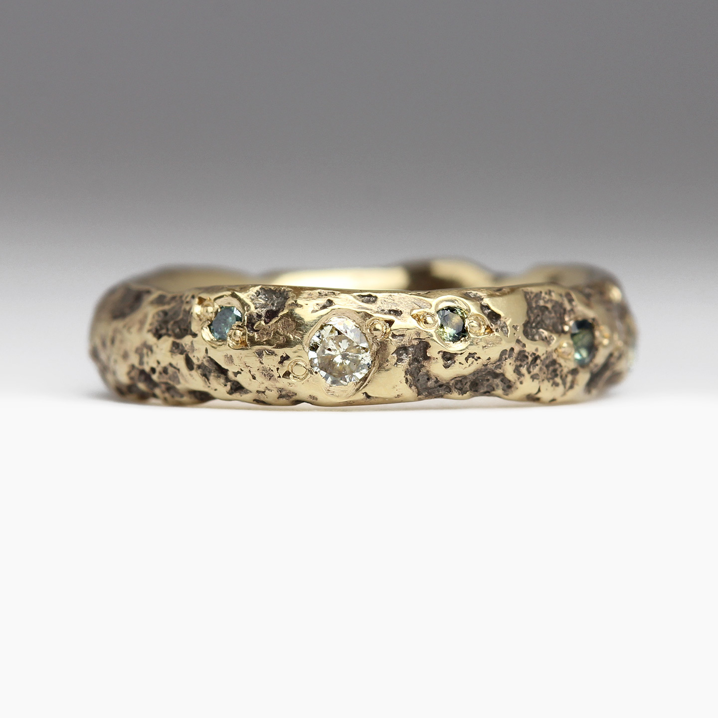 We also looked towards our 4mm Extra Texture Sandcast Diamond Scatter Ring for inspiration. Our customer opted to replace the majority of the scattered diamonds with the oceanic tones of blue diamonds and dual toned blue & green sapphires. We love the harmony of hues and how the gemstones seem to emerge entirely organically from the darkened divots of oxidised texture.