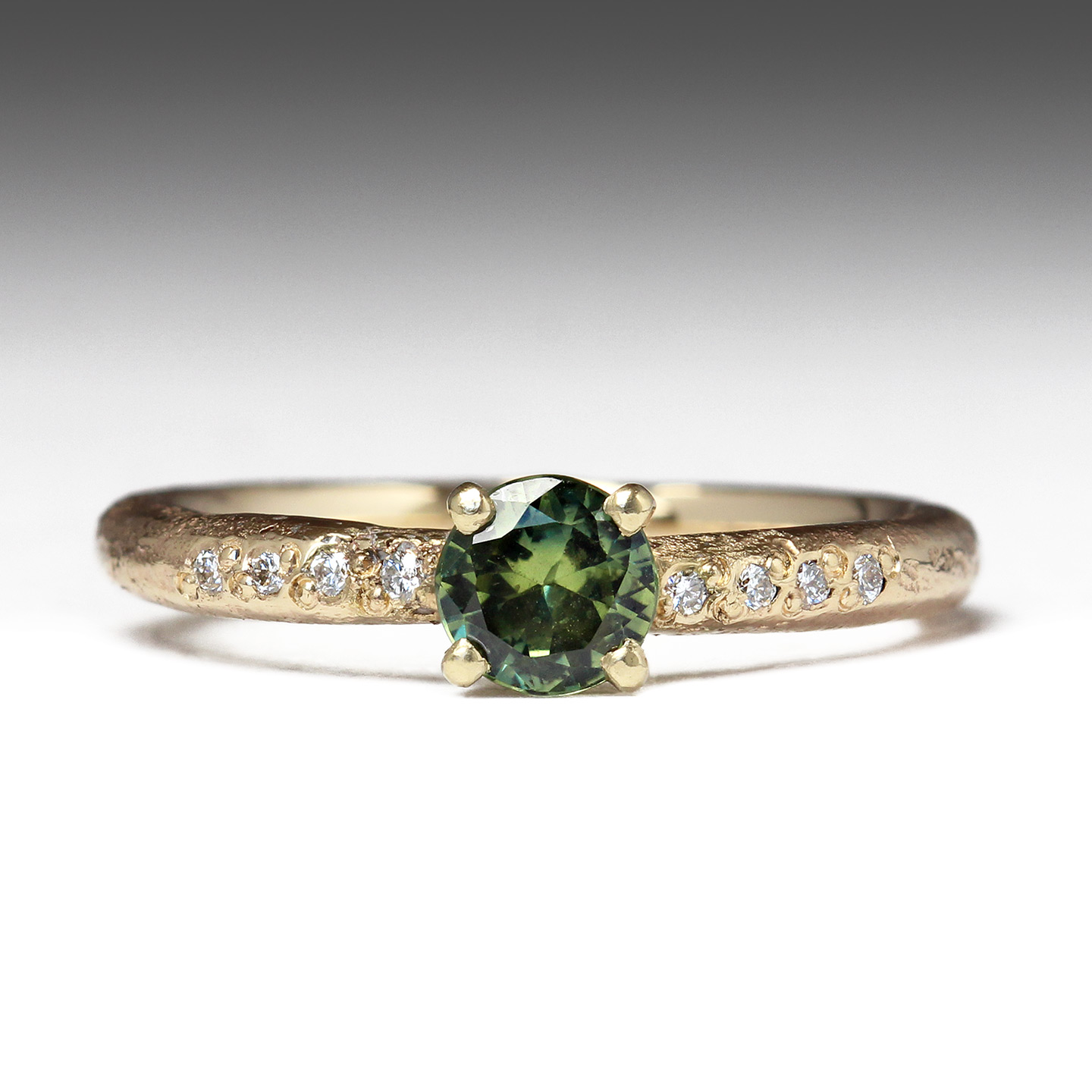 Green Sapphire & Diamond Flanked Sandcast 9ct Yellow Gold Engagement Ring
