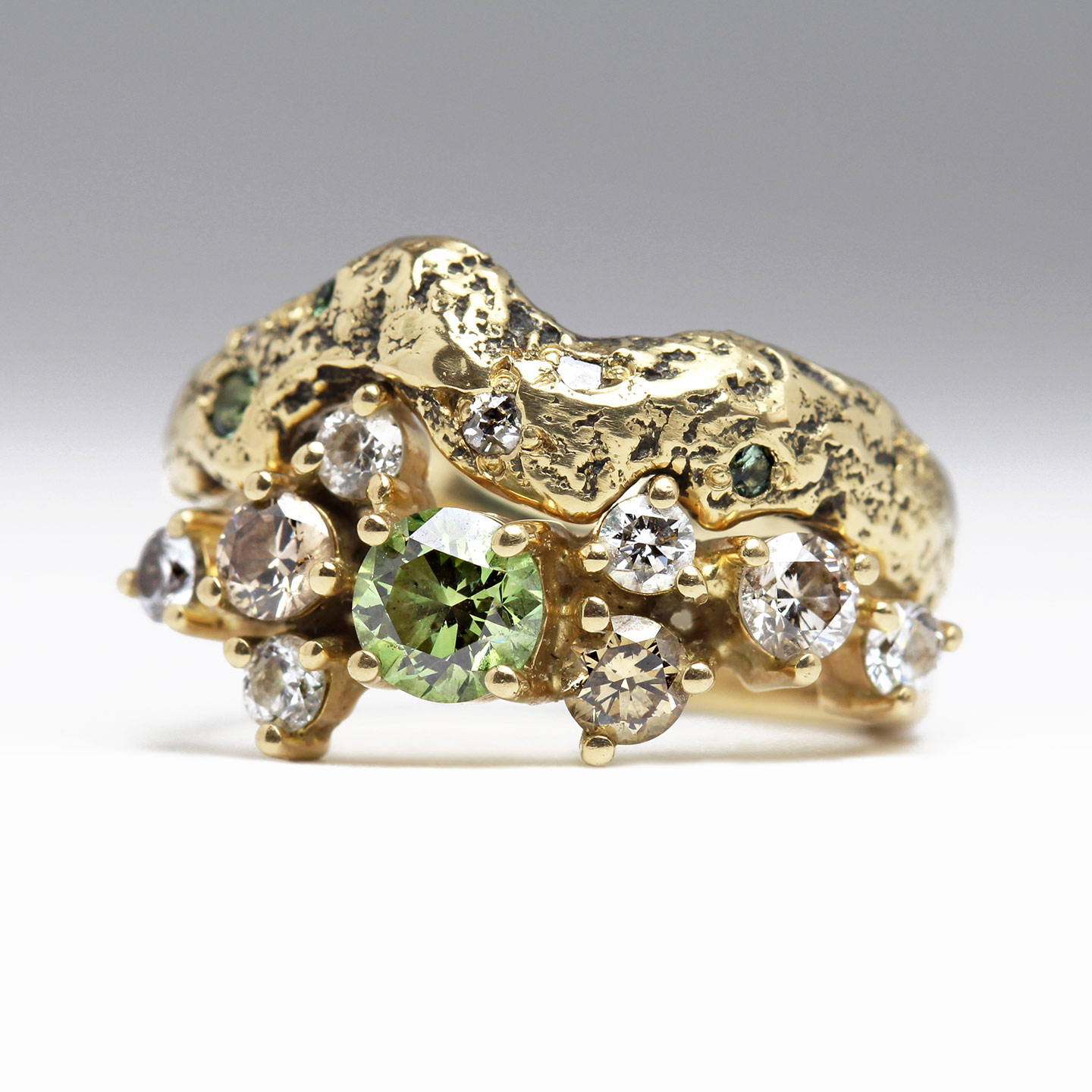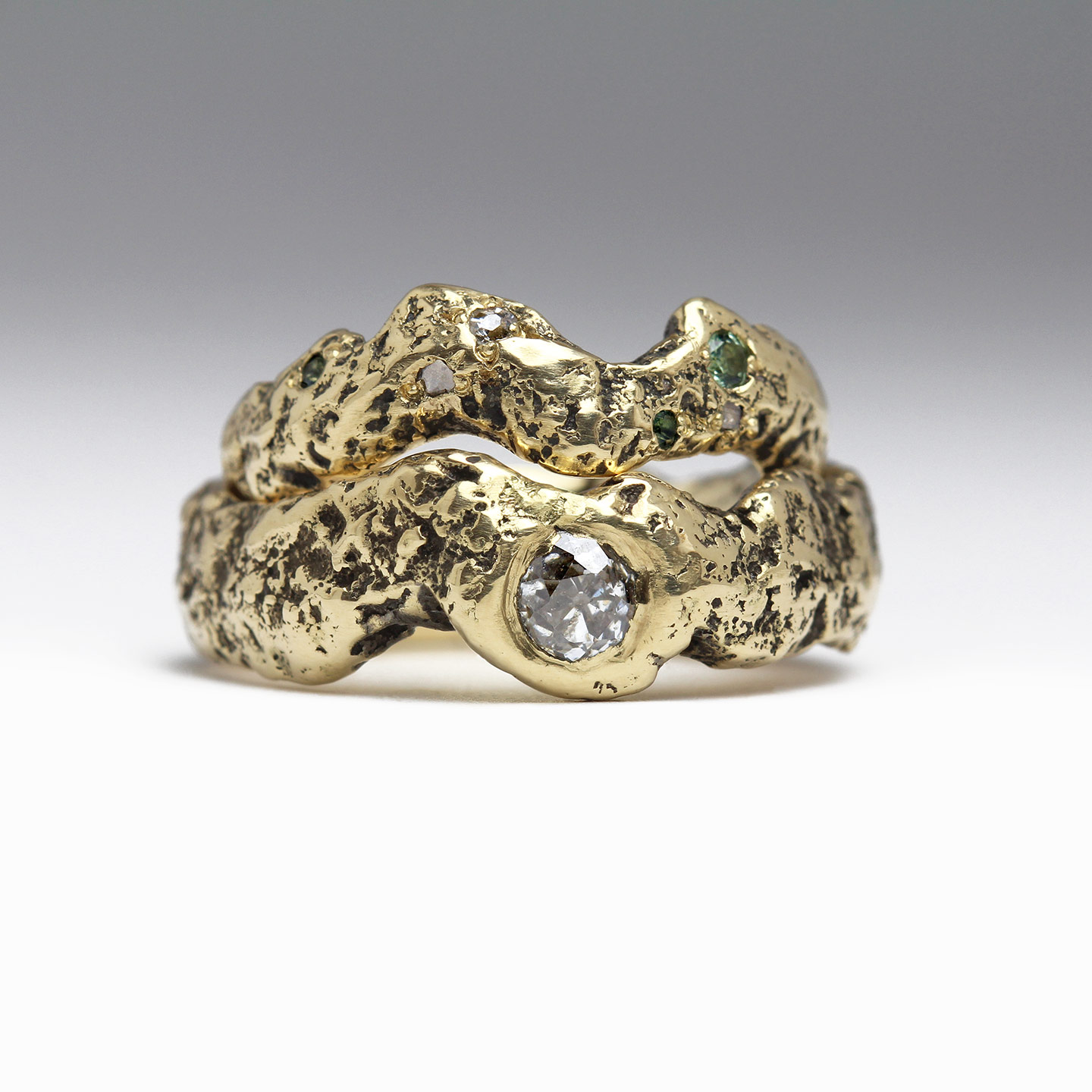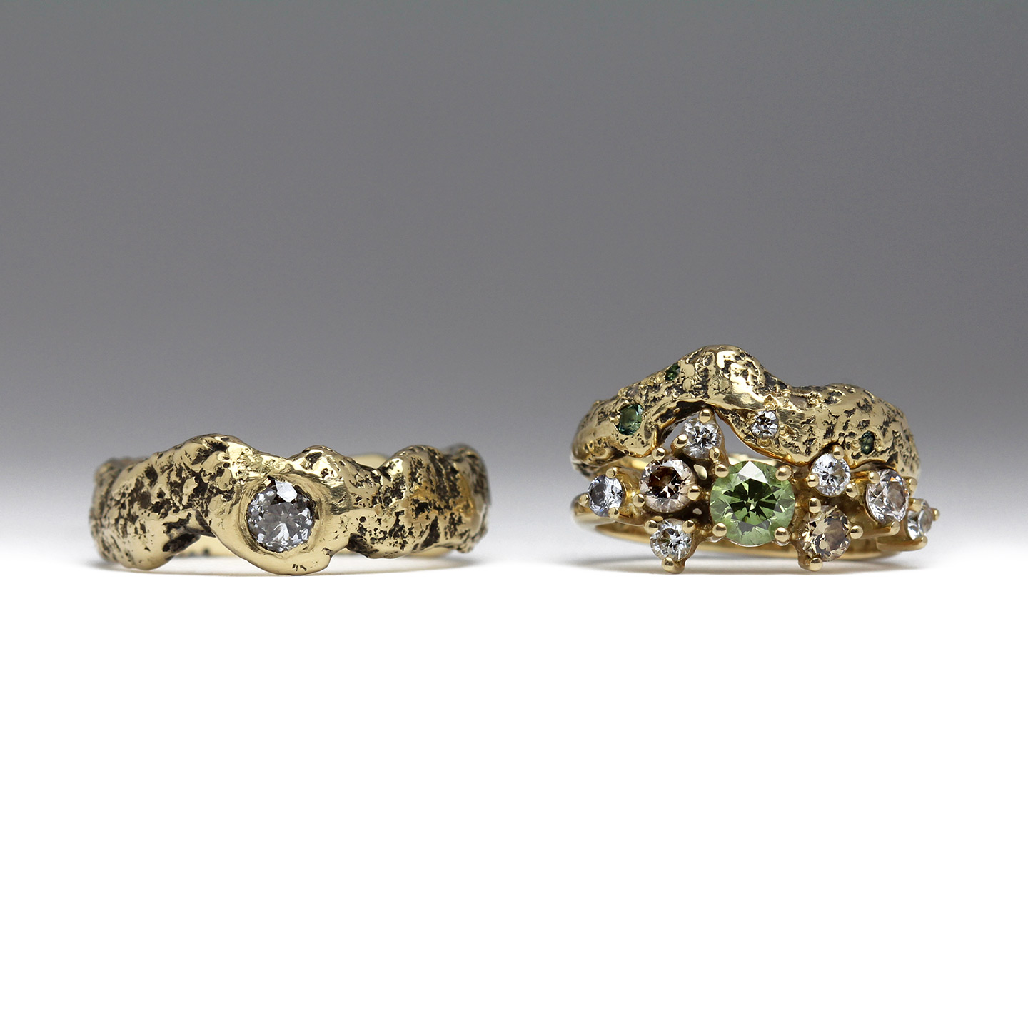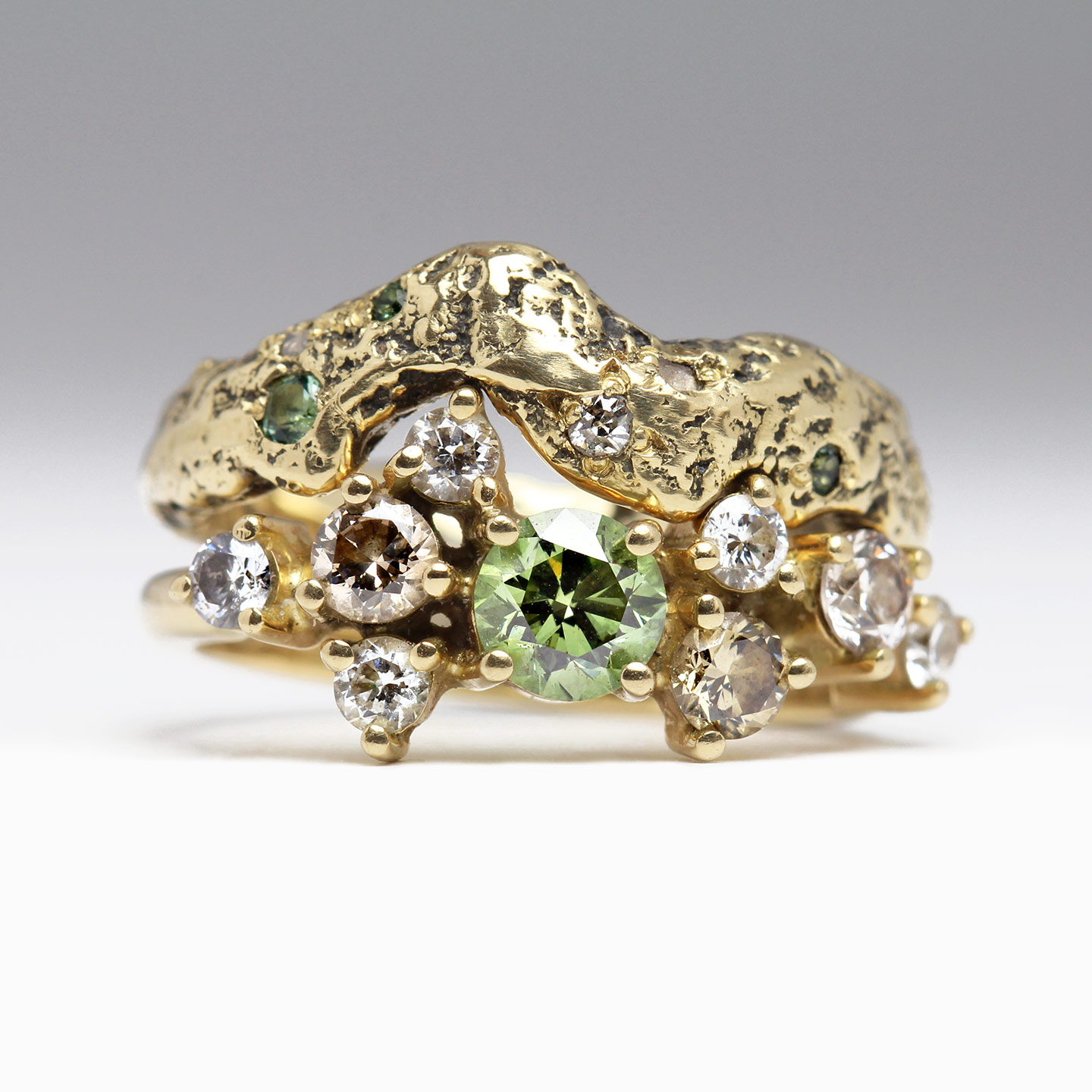 The ring set with vintage diamonds & tourmalines was designed to compliment the dainty and sparkly engagement ring. We love how the glittery green hues of the gemstones unify the rings as a set, while the oxidised, rugged texture provides a beautiful contrast to delicate claw settings.