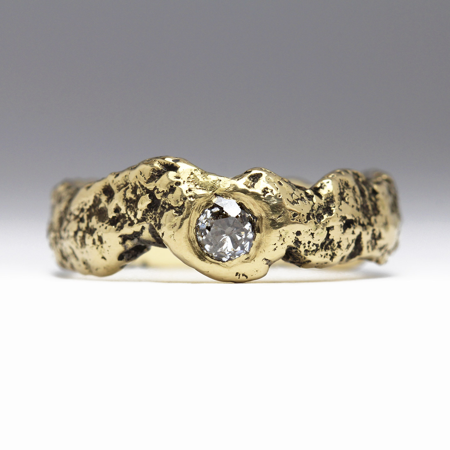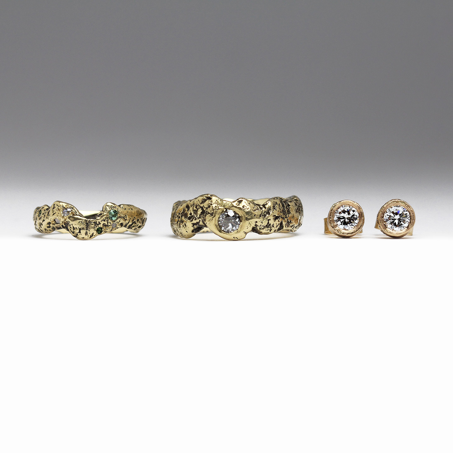 Shaped Wedding Set of Rings with Old Mine Cut Diamond, Vintage Diamonds & Tourmalines in Sandcast Extra Texture 14ct Yellow Gold & 9ct Yellow Gold Sandcast Earrings with Diamonds