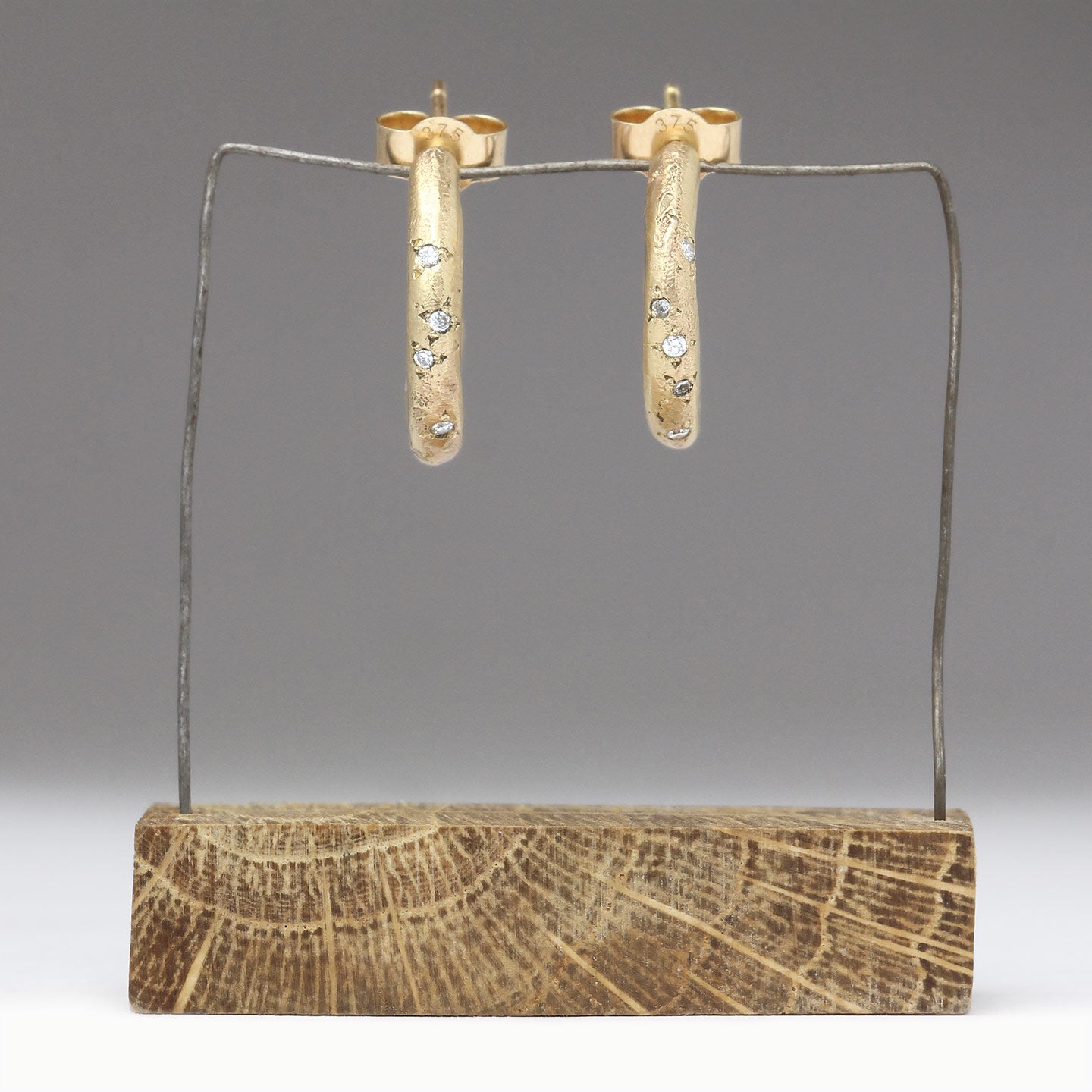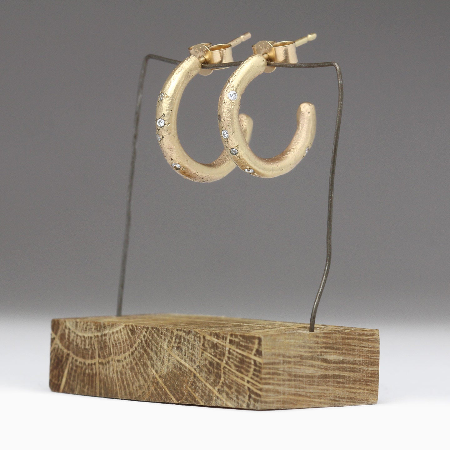 Regular price £1,575.00A chunky pair of sandcast hoops set with a scatter twelver of Canada Mark diamonds.