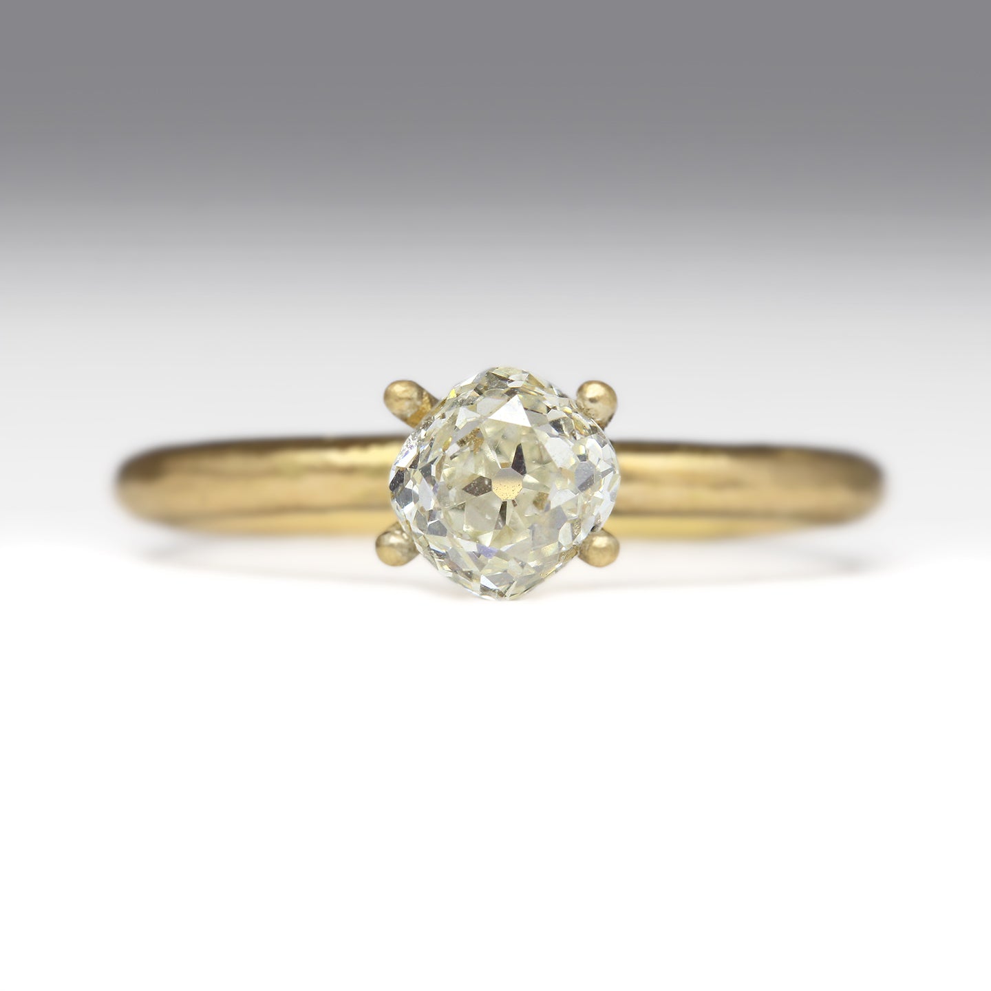 Old Mine Cut diamonds are evocative of the past. They were cut by hand hundreds of years ago, following the natural octahedral shape of diamond crystals. As such, the proportions of each stone will vary, and we’ve found that they often come into their own the most when set in yellow gold. They reflect the warmth of the gold beautifully and in much the same way that they would have reflected candlelight many years ago.