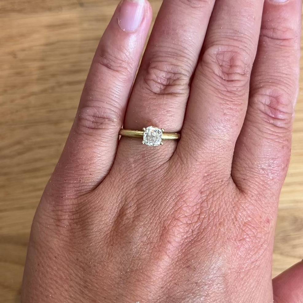 This 0.93ct Old Mine Cut diamond is a classic deep cushion shape, measuring 5.4x5.2mm. It can either be set squarely as shown in the video, or in a diamond orientation as pictured.