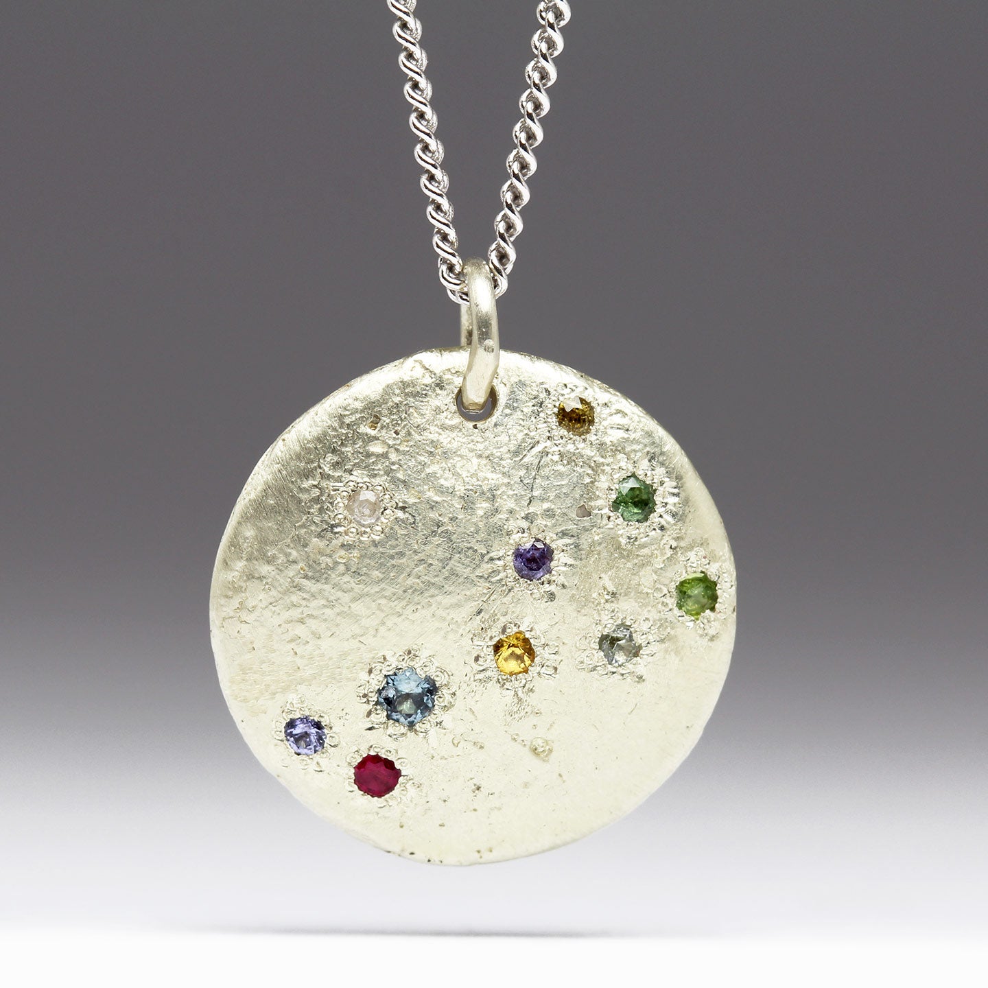 Regular price £1,235.00Made by Sophie, this pendant was cast in recycled 9ct white gold in Sennen sand, and set with rainbow sapphires, tourmalines and a ruby. It's slightly domed and has a lovely tactile feel with a subtle pop of colour. It comes on a matching 18" 9ct white gold curb chain. If you would like an alternative length, please let us know at checkout (we keep 16" and 20" in stock).