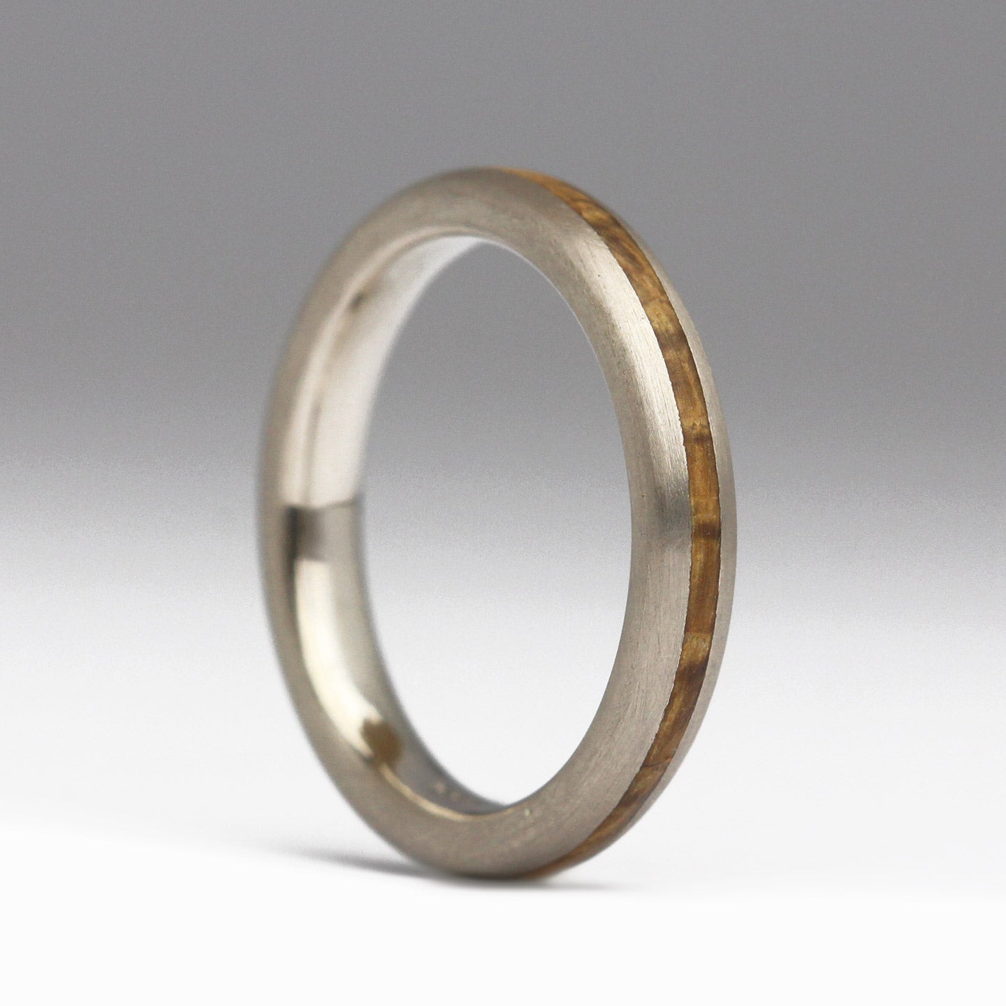At just 3mm wide, this is the thinnest we make a wood inlay ring. A slim inlay of wood is bordered by a contrasting metal of choice, protecting and showcasing the hardwood.