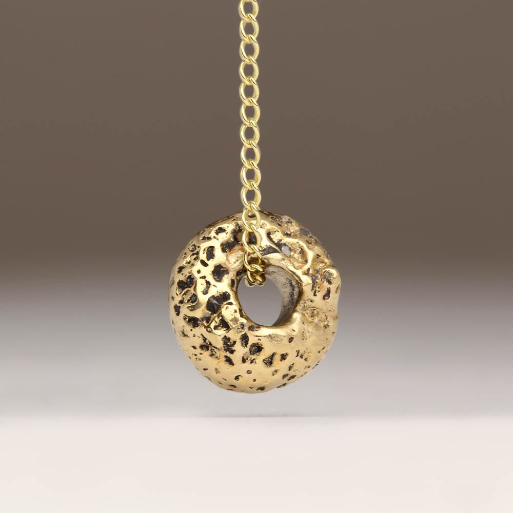 This 9ct yellow gold sandcast pendant is reminiscent of the ancient the Cornish standing stone Men-an-Tol. Cast in sand from Sennen beach and hanging on an 18" 9ct white gold chain, this is a delicate and subtle pendant which wears well for any occasion.