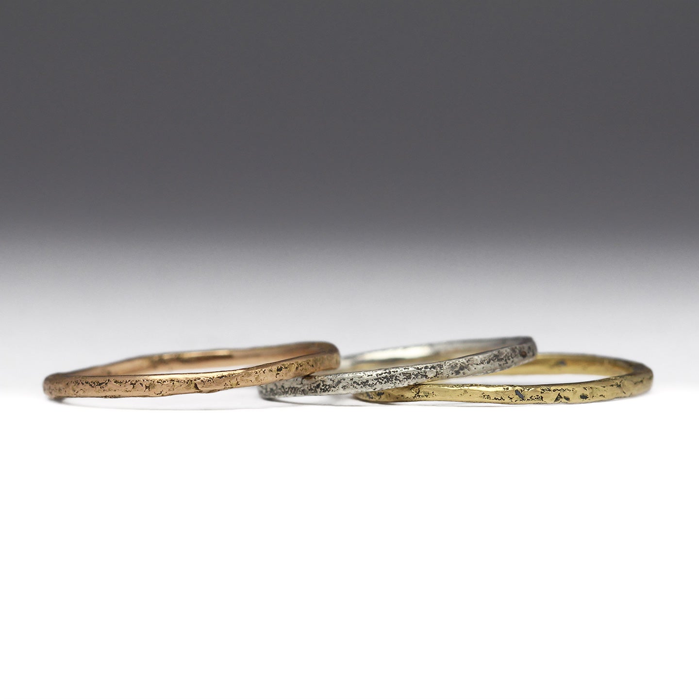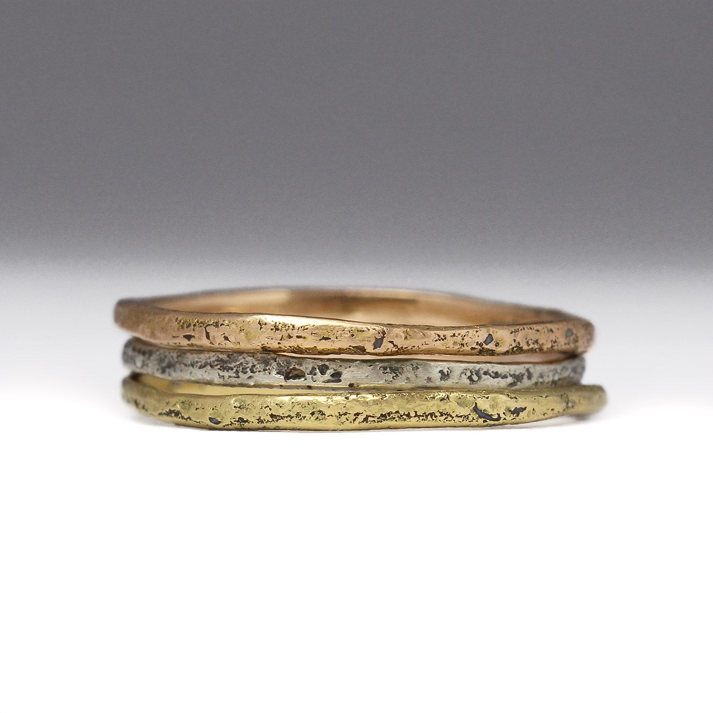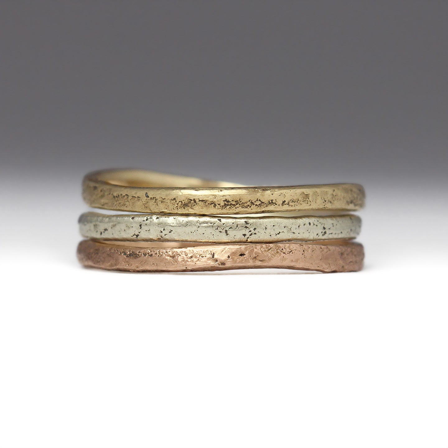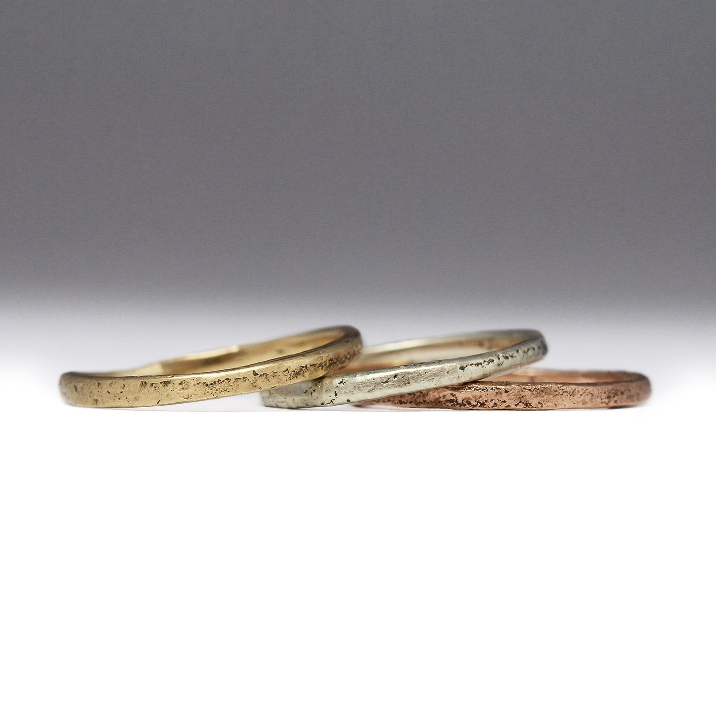 Handmade and cast in beach sand with recycled metals, a standard set of these rings includes one each in yellow gold, rose gold and white gold. These skinny stacking rings have a flat profile and antique polish finish, and can be worn individually or mixed together to create a set of rings in varying colours of gold. The metals have a subtle, organic feel and the texture is imparted by the sand mould they are cast in.
