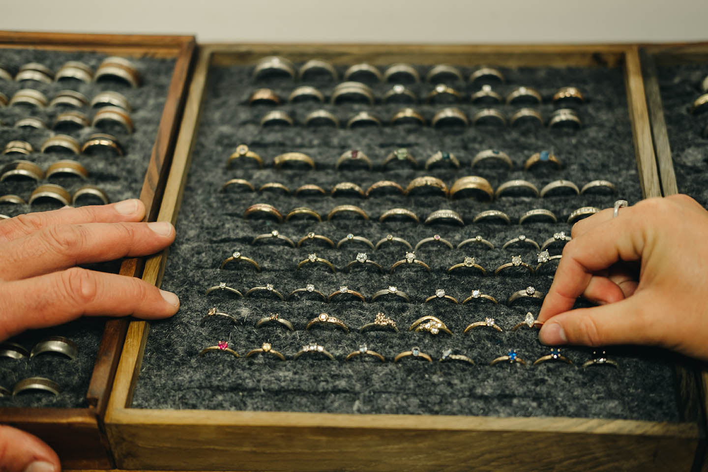 Image shows a box with a plethora of handmade rings. Two hands are seen choosing rings from the box