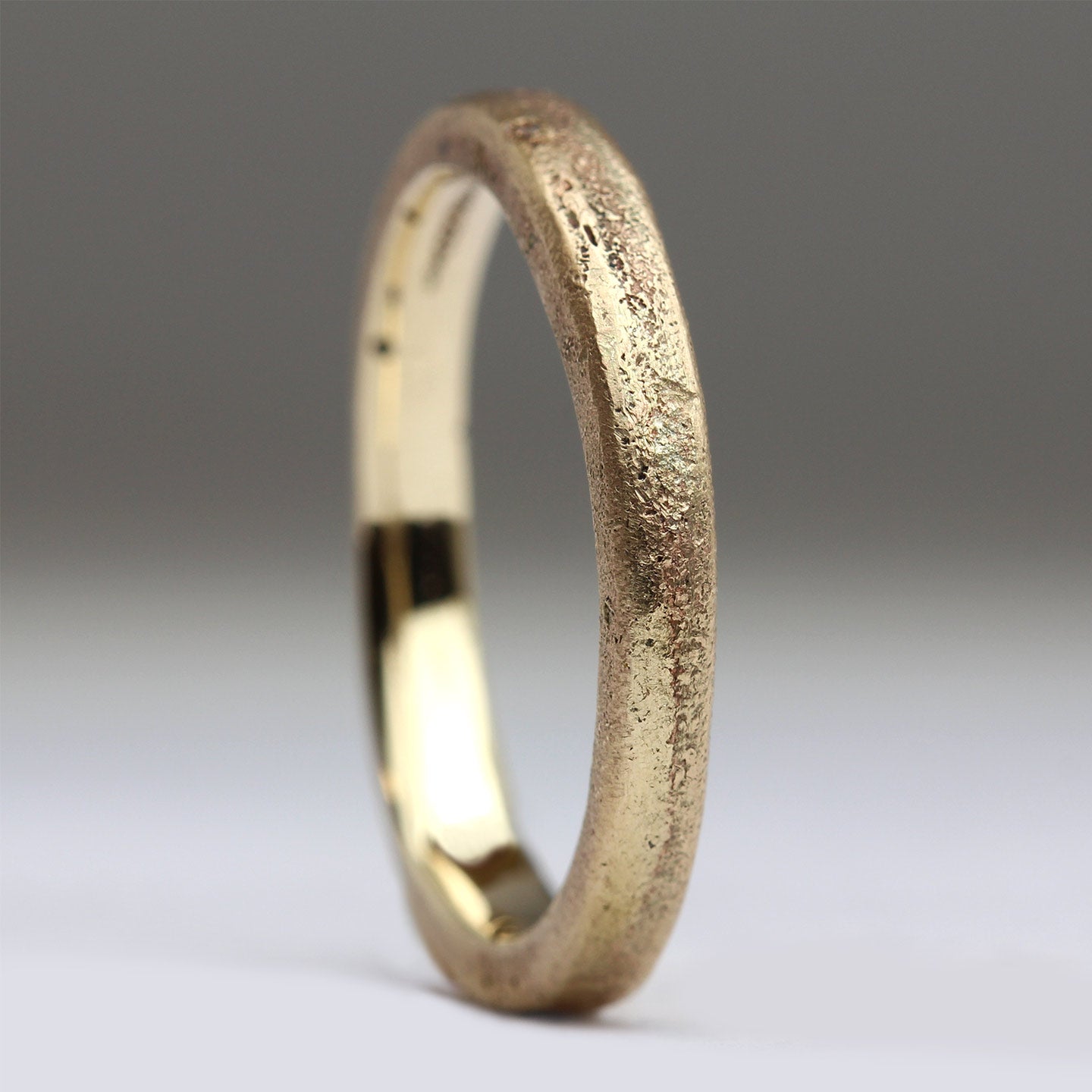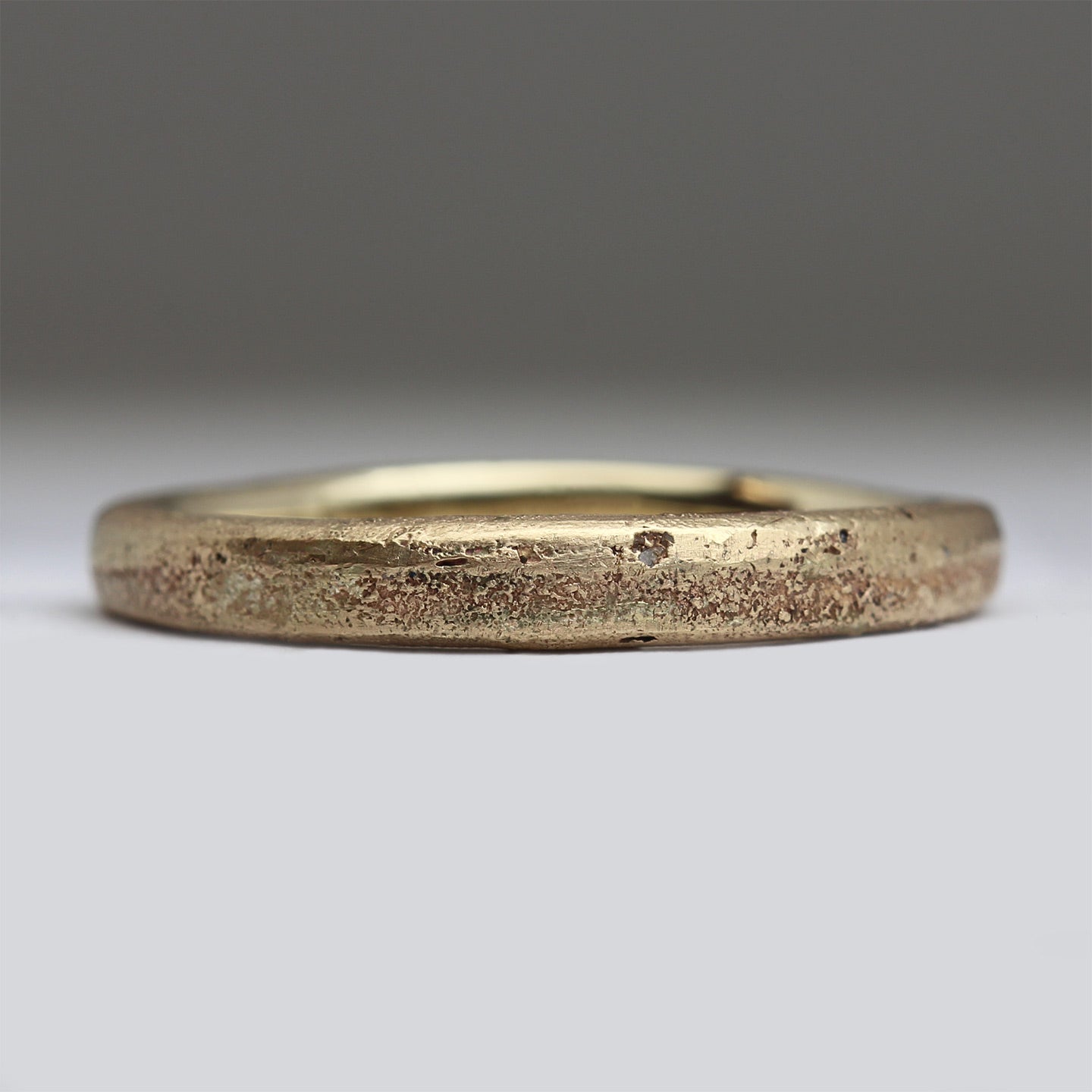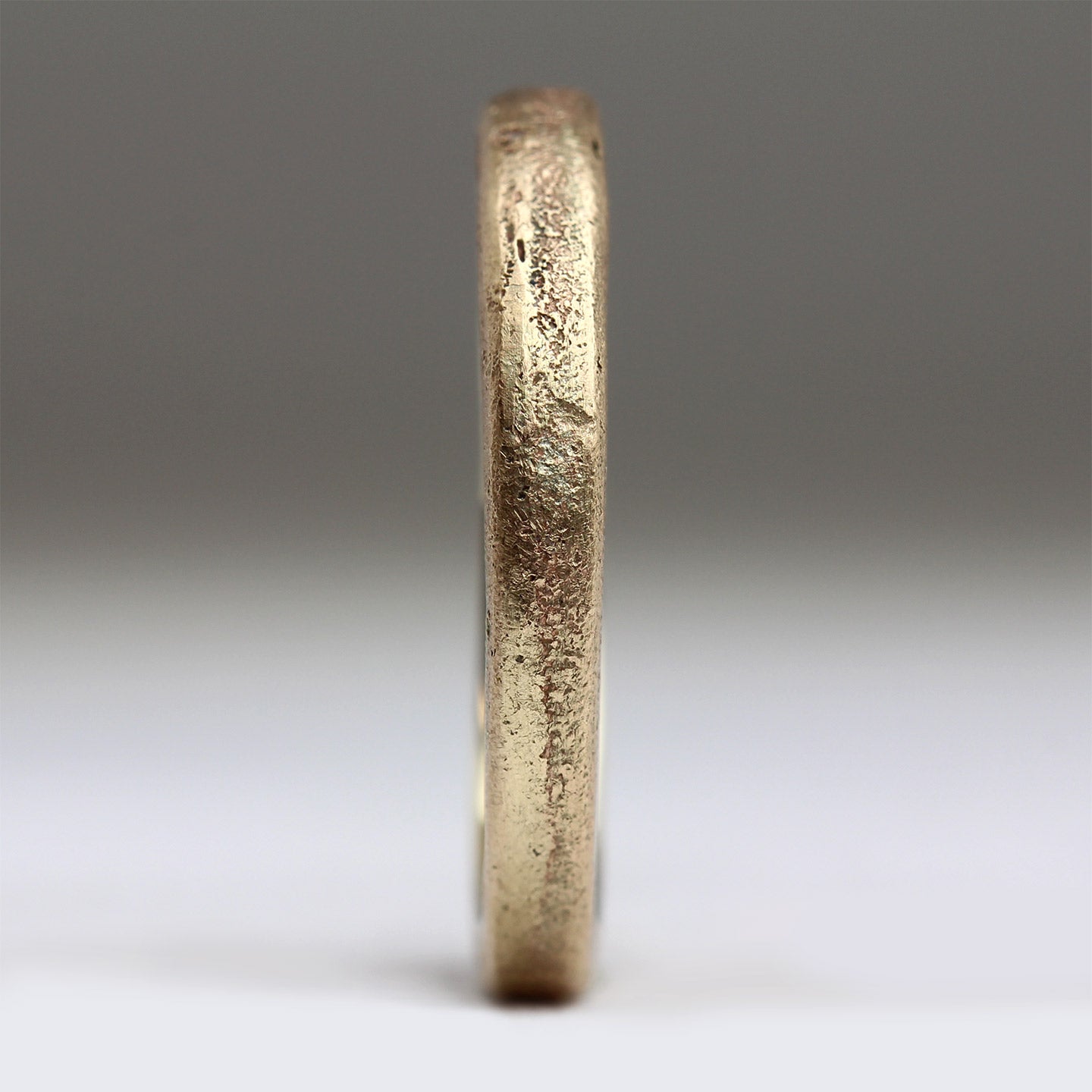 Flat 3mm wide ring, made from recycled 9ct yellow gold cast in beach sand. The sand not only creates the texture on the ring, tiny grains are captured in the metal too.