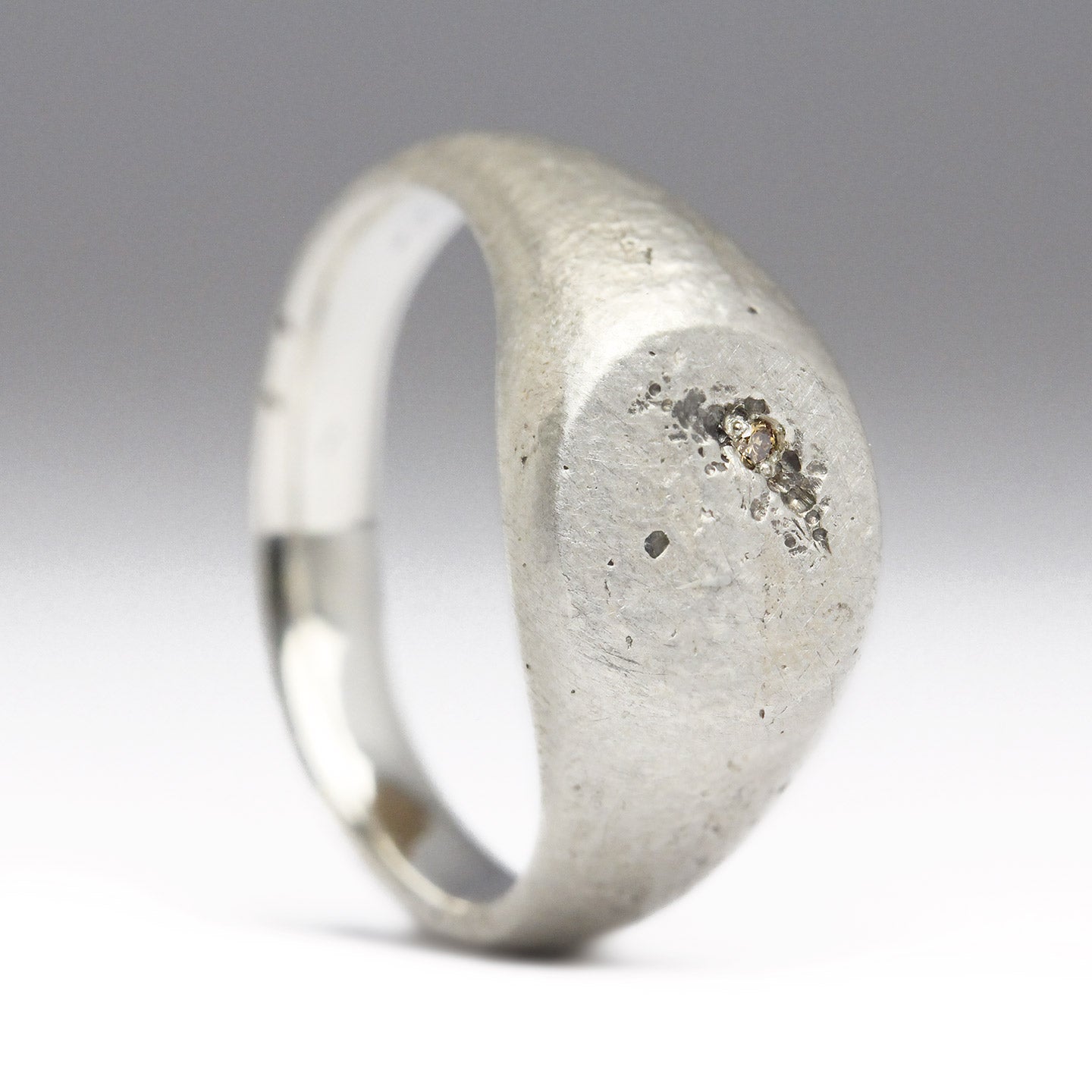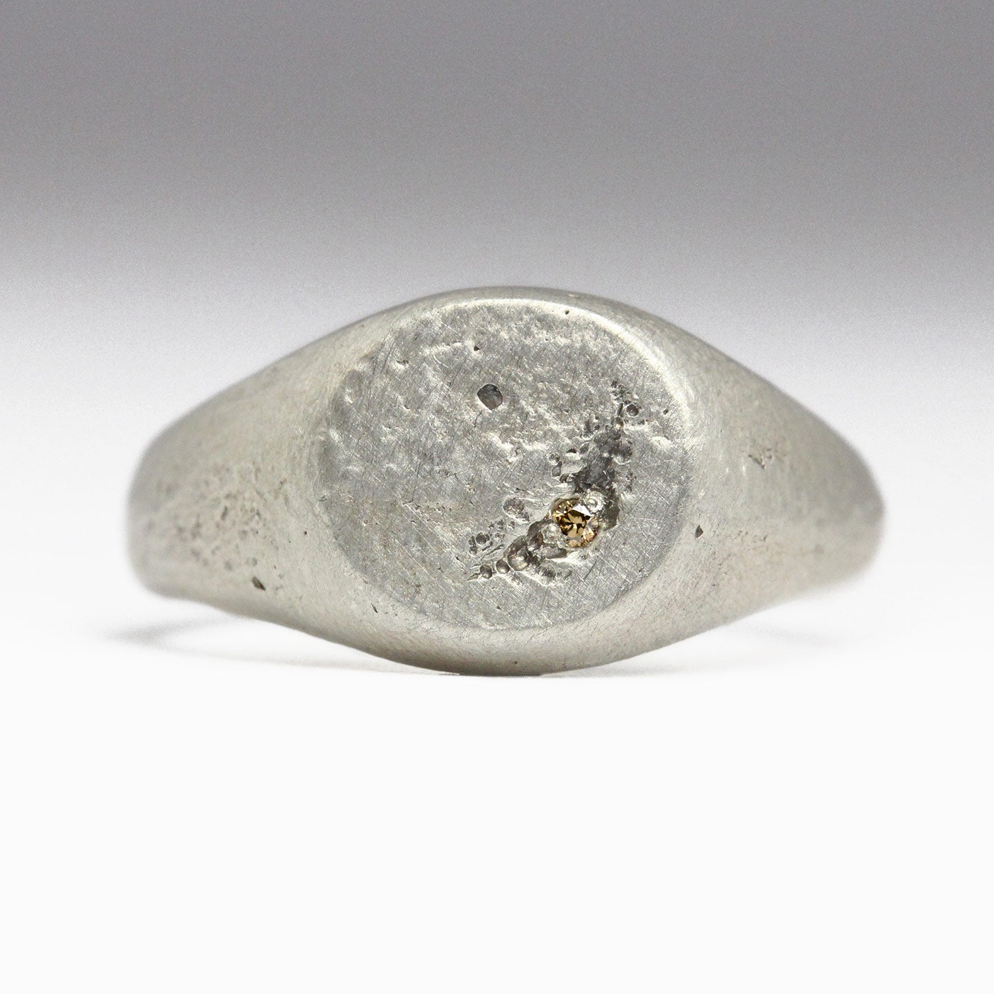 A Sandcast twist on a signet ring. Our signet rings are hand carved from wax and cast in beach sand. The signet face is 10x10mm with a tapering shank for comfort. A little 1.2mm champagne diamond set into the texture gives the piece a subtle sparkle. This diamond is fully traced from its mine of origin, the Argyle in Australia.
