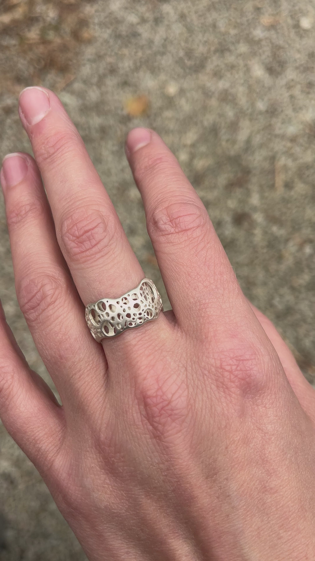 The layered sea foam ring is an organic piece that varies in width and shape, made from recycled silver.