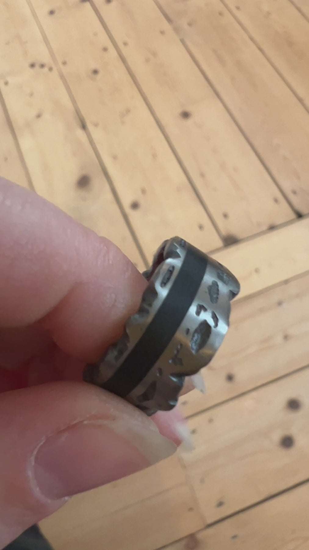 Please note that it is not the ring pictured, as each piece of wood is different. This 10mm rock ring is inlaid with ebony wood - the ring is video in the second slide. It is a size M3/4.If you would like to have a version of this ring made especially for you in your choice of metal and wood, you can do so here. There is no additional cost, only additional waiting time.