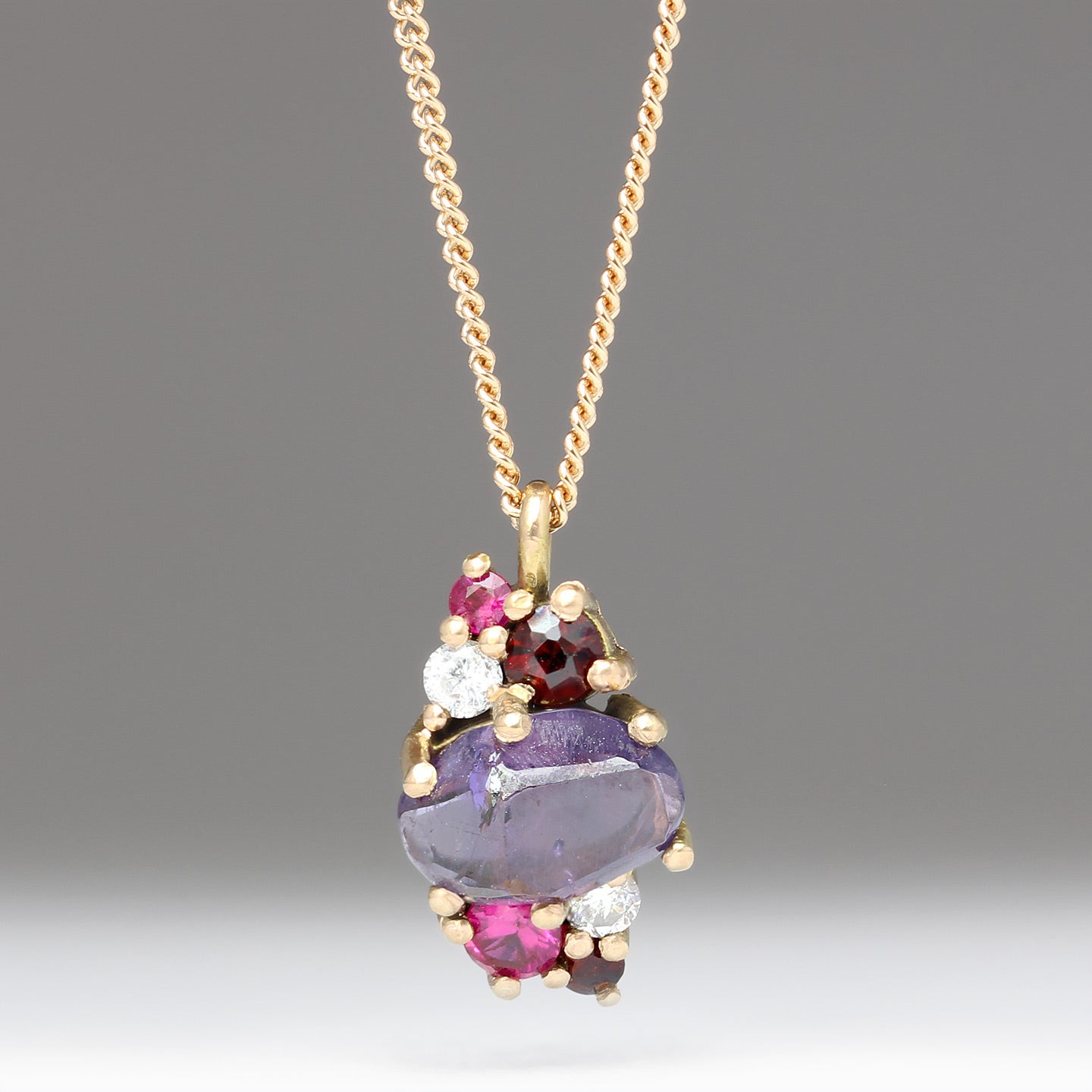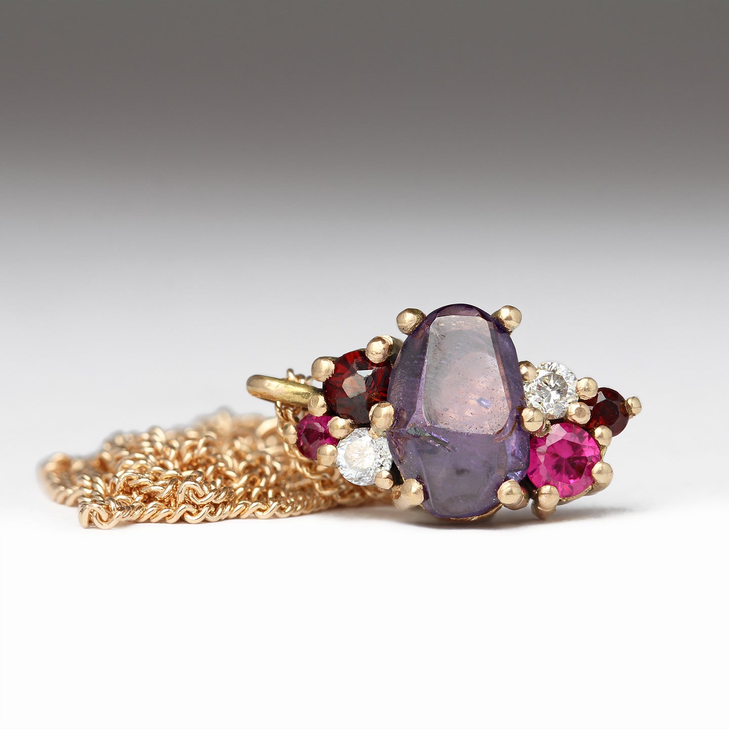 Made by Justin and Andy, this pendant showcases an organic hand cut purple sapphire with a cluster of deep red garnets, dark pink sapphires and white diamonds. Set in 18ct rose gold, the colours marry together beautifully, breathing new life into these reclaimed gemstones.