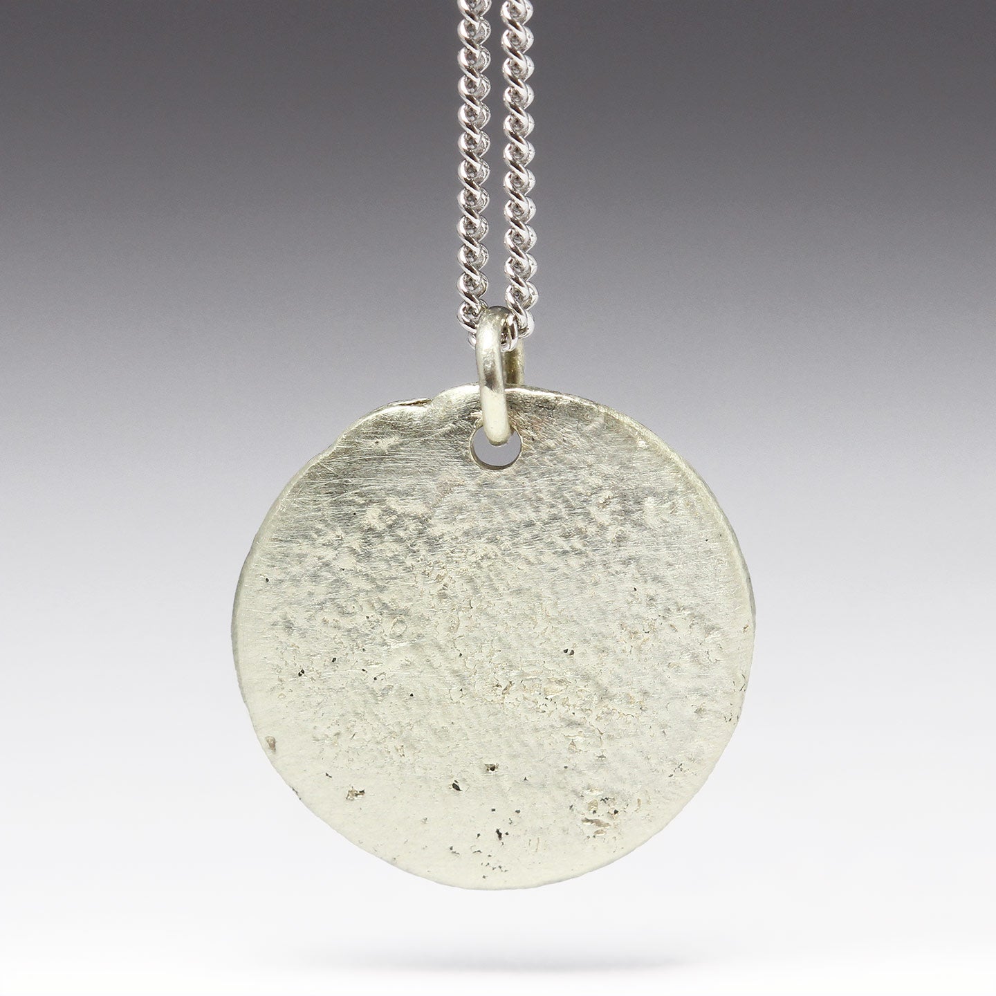 The sandcast disc pendant is particularly good at picking up a lovely delicate texture from the sand it is cast in, if you look closely you can even find little grains captured on the surface. Hanging on a matching curb chain, this is a subtle necklace which wears well for any occasion.