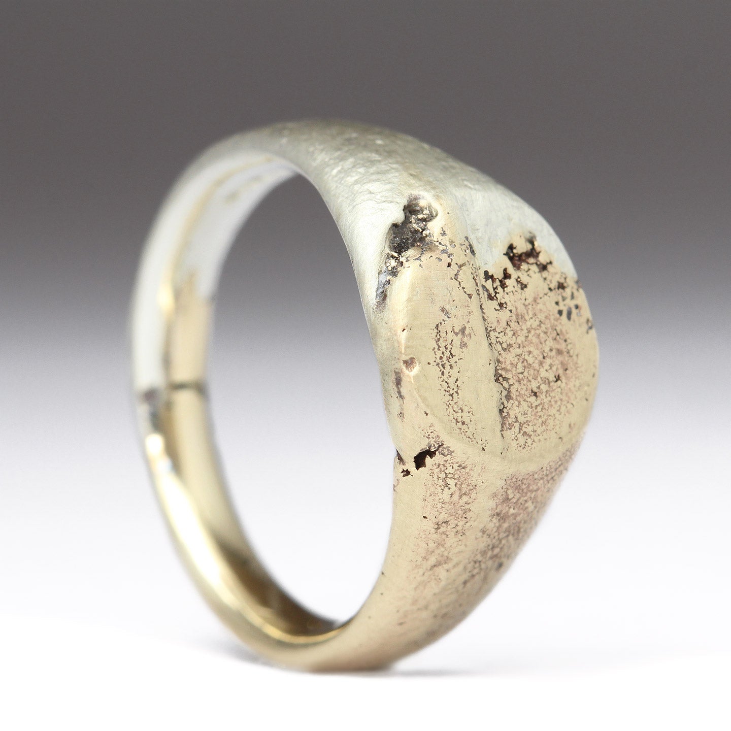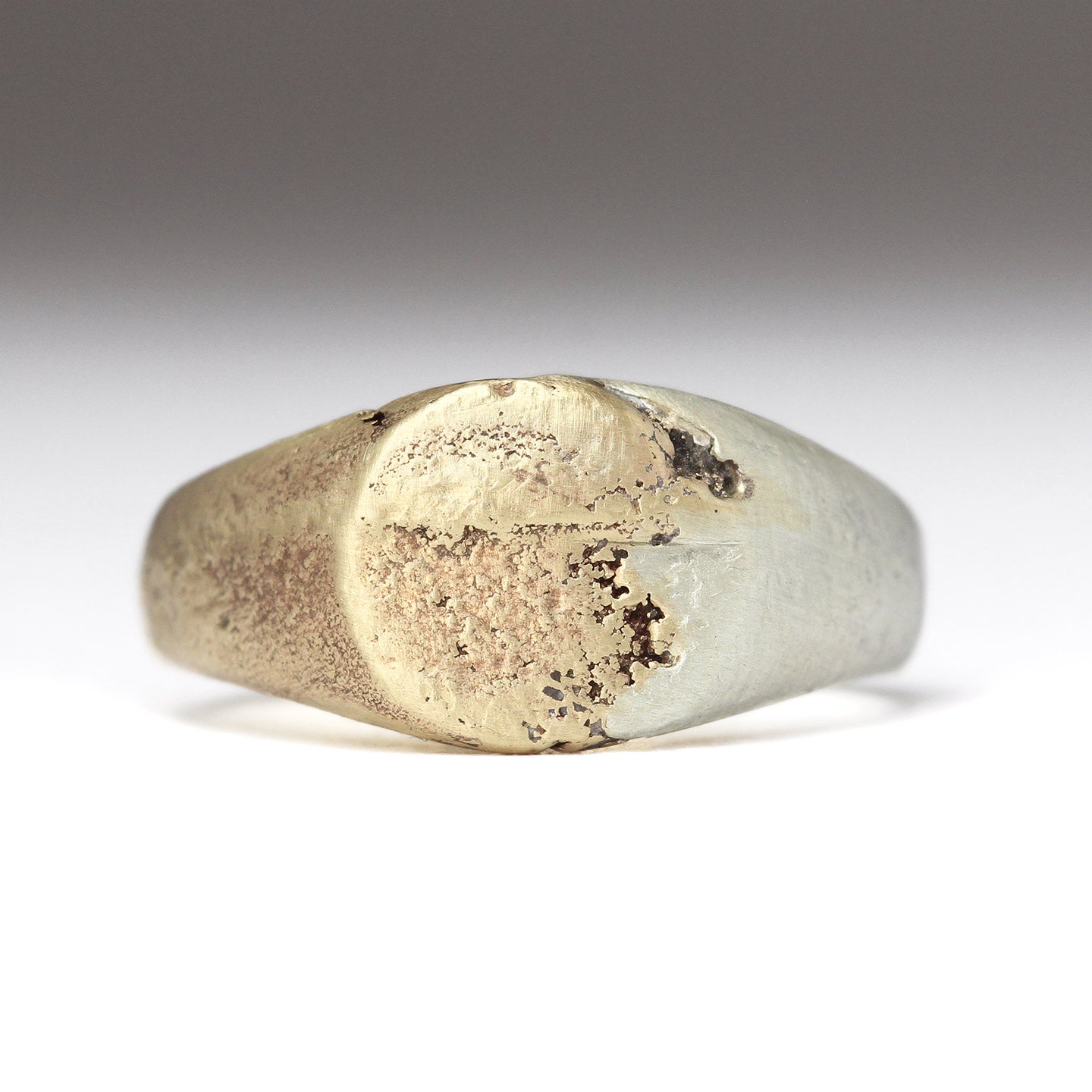 Made by Sophie, this two-tone signet ring fluidly merges 9ct yellow gold and silver together. Cast in sand from Marazion beach, this ring has a sandy texture which compliments the tidal-like meeting of the two precious metals.